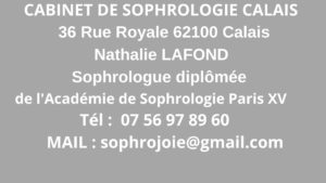 Je suis Diplômée de l’Académie de Sophrologie Paris XV, école du Docteur Patrick-André CHENE qui a collaboré avec le professeur Alfonso CAYCEDO pendant de très nombreuses années. Mon cabinet est situé en centre-ville de Calais, 36 Rue Royale, à 10 minutes à pied de la Gare. De l’adolescent au senior vous trouverez un accompagnement adapté à votre problématique. Dans le respect du code de déontologie, sans jugement, je vais vous aider à traverser sereinement ce moment compliqué de votre vie : l’anxiété, le stress, l’addiction, l’acceptation de l’homosexualité, l’insomnie, l’image de soi, le burn-out, le deuil, la douleurs chroniques… la sophrologie a depuis longtemps (plus de 50 ans) fait ses preuves et est utilisée par les professions médicales et paramédicales.